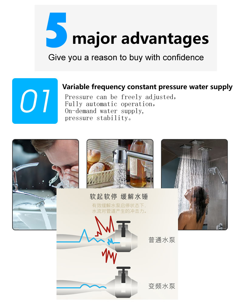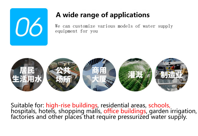Variable frequency constant pressure water supply equipment by air pressure tank, pump and electric control system is composed of three parts, its outstanding advantage is, no need to build the tower, a small investment and land occupation, flexible layout, fast completion. In the frequency conversion constant pressure water supply equipment using automatic regulation of water and gas, automatic operation, energy saving and tap water automatically connected to the grid, the power supply is still available after the water, no need to monitor after debugging. Constant pressure water supply technology advanced, constant pressure, convenient operation, reliable operation, saving energy, high degree of automation, widely used in enterprise units, residential areas and rural production, living, office water supply. Suitable for water supply households in 5000 households, the daily water supply in 3000m3 places, the water supply height of more than 100 meters.