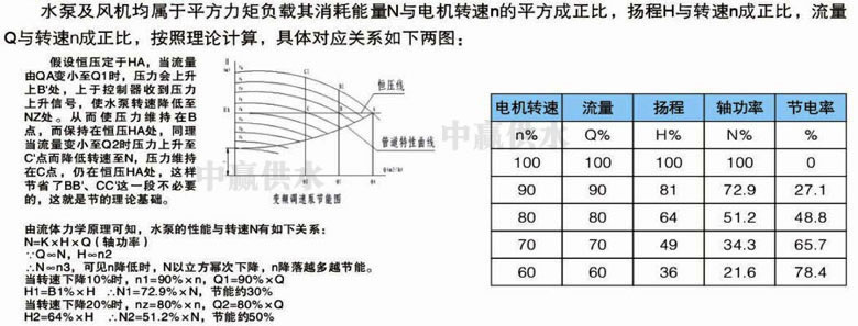 HBW無負壓供水設備與自來水輸水管網直接串接,可以充分利用自來水管網原有的壓力;采用節能智能變頻控制技術,設備的電機泵在微機控制下,根據自來水的壓力來調節電機的轉速,只對自來水的進水壓力和所需壓力的差進行補壓,不做無用功,節能效果顯著,與傳統設計的采用常規繼電接觸器控制的給水設備相比,節電可達20%60%以上。其節能分析如下:
