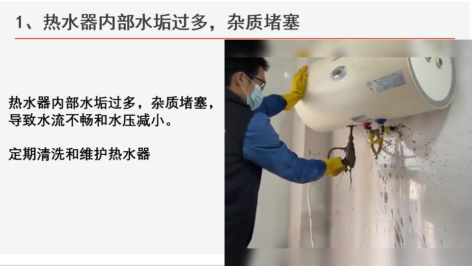 1、熱水器內部水垢?,雜質堵塞,導致水流不暢。